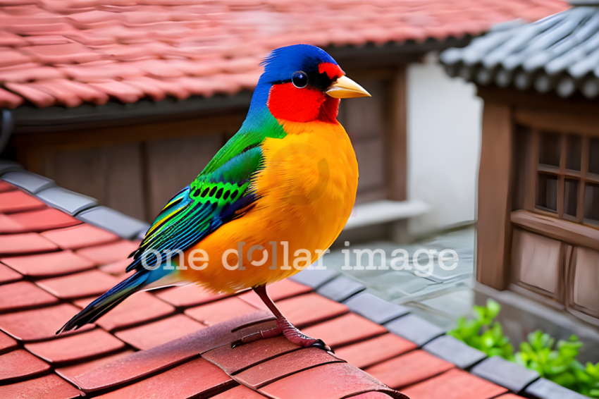 Imagine a picturesque garden in the heart of a charming village where a colorful and utterly charming bird with vibrant plumage perches on a red tiled rooftop Describe this enchanting bird