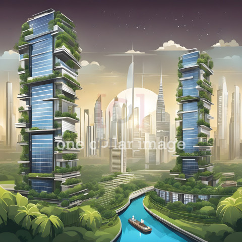 The skyline of future cities has transformed into a fusion of traditional and futuristic architecture. Towering skyscrapers are adorned with intricate energy-efficient designs inspired by Indian mot.